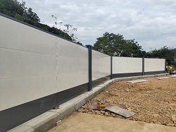 施工圍擋用白色彩鋼板作墻體,用藍色雙拼C型鋼作立柱,立柱頂部配藍色造型端蓋(可裝路燈),圍墻四周用藍色彩鋼框邊。高矮、大小、色澤一致。臟污后隨時可用水清洗擦拭。